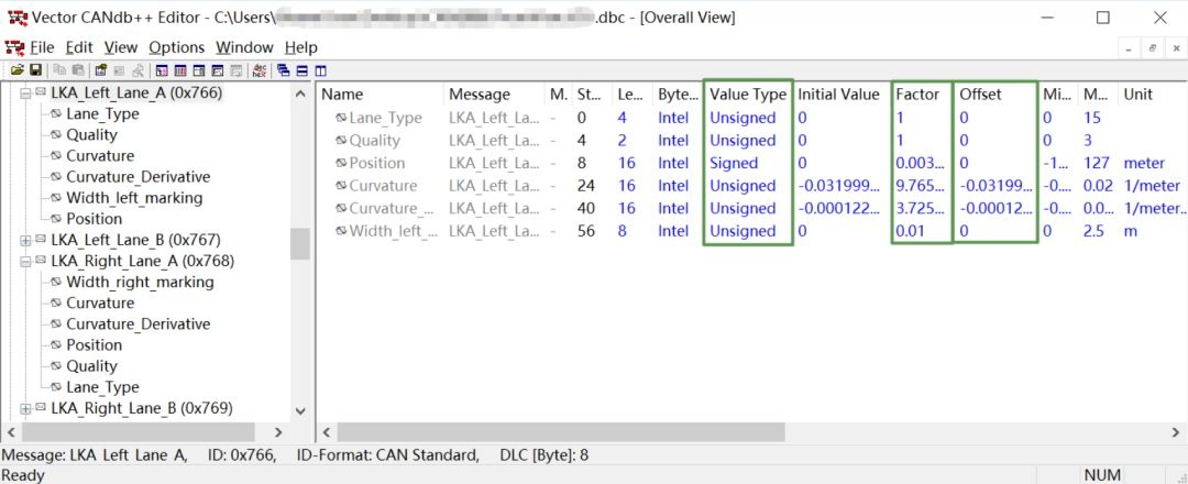 以id号为0x766的LKA_Left_Lane_A为例,在Mobileye的无人车左侧车道线检测系统中包含着重要的信息数据:其中包含左侧车道线的偏移量与曲率等关键参数信息。在当前帧的数据包中(Message),通过五个关键信号(Signal)来表征这一区域的状态:分别为Lane_Type标识类型(类型)、Quality表示质量评估结果(质量)、Curvature表示曲线程度(弯曲度)、Curvature_Derivative表示曲率的变化速率(变化率)、Width_left_marking表示左侧标记条纹宽度(左右标记条宽)以及Position的位置坐标数据(位置坐标)。