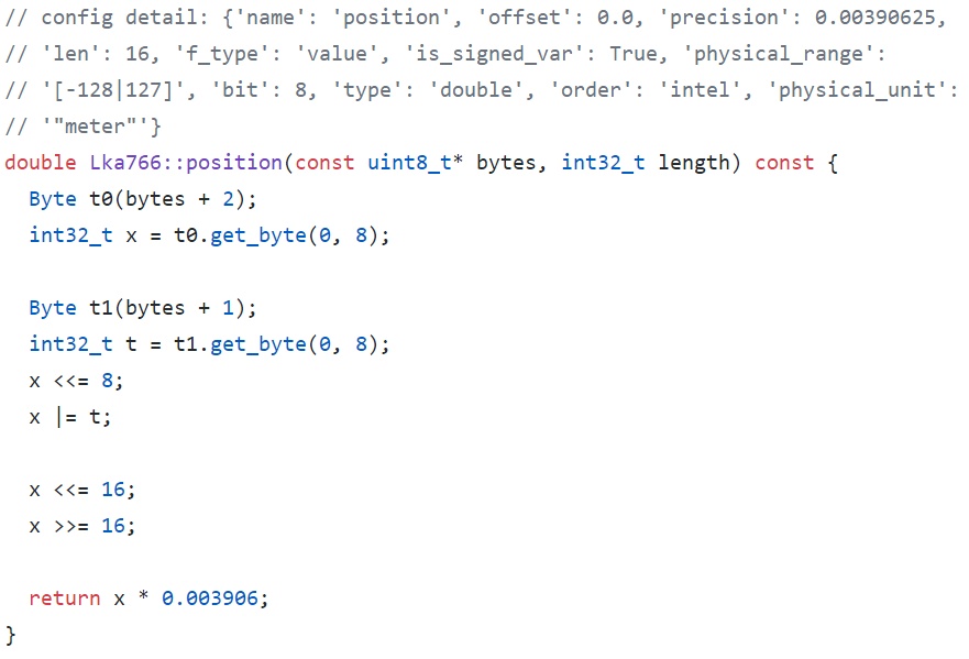 当Factor值不等于1时涉及的物理量中存在Position这类变量时,则需要通过移位运算来进行解析过程中的计算,并且该过程对应的公式结构维持不变。参考百度Apollo开源项目的实现思路。