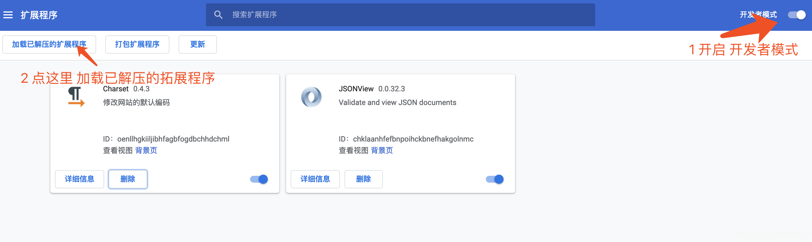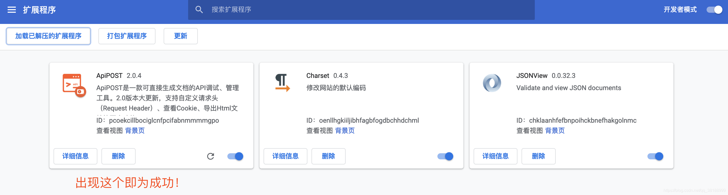 在右侧顶端打开开发者模式,在应用程序列表中单击【加载已解压的应用程序