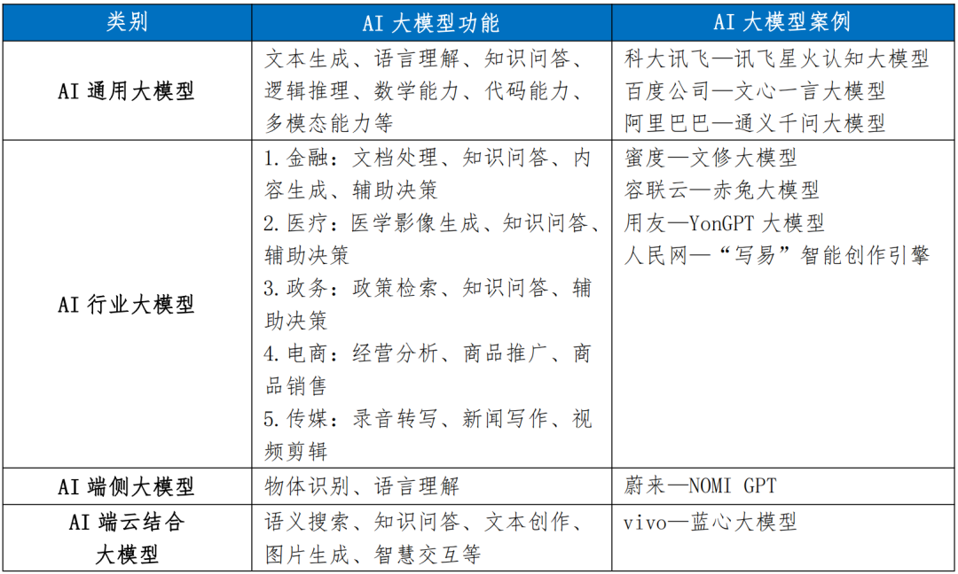 我国具有代表性的一类通用 AI 大模型主要包括科大讯飞的讯飞星火认知系统等实例;而行业级 AI 大型语言处理系统则涵盖蜜度的文心-小红书版AI基础认知系统、容联云的赤兔大语言处理系统以及用友网络 YonGPT 专业版;此外,在端云架构下兼具云侧与端侧计算能力的大规模AI基础认知系统主要有 vivo 的蓝智全场景智算引擎;最后,在端侧计算领域以蔚来的 NLP 专业级开源基础预训练语言模组 NOMI GPT 作为主要代表