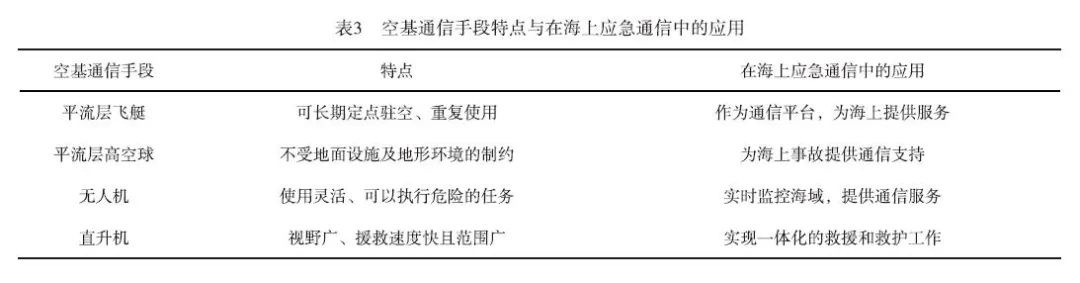 空基通信手段采用平流层飞艇、高空气球等飞行器以及直升机作为载体,在海上得到了广泛应用**(如表3所示)**。得益于无障碍物的开放环境,在水面之上实现了良好的通信质量保障。通过空基通信手段可极大提升通信距离并扩大地面网络覆盖范围,在空中完成了信息的中转与交互过程。