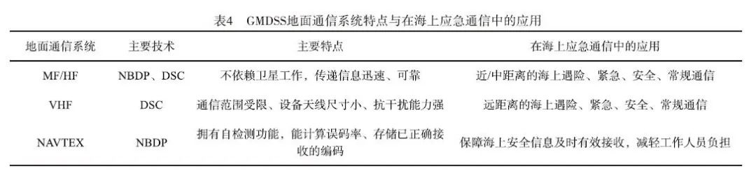 GMDSS采用高精尖的通信技术[14]来确保海上信息传输的顺畅性。无论船舶处于何处海域,在发生紧急情况时,在线或离线均可实现与岸上或邻近船舶之间的有效联系。这一系统的主要目标是最大限度地保障海上人员和财产的安全。其中,GMDSS地面通信系统[15]主要涉及MF/HF/VHF系统网络,并通过数字选择性呼叫(DSC)技术和窄带直接印字电报(NBDP)技术取代传统的摩尔斯电报技术,在实现电传通信的同时具备应急报警功能和无人值守特性。随着GMDSS现代化进程的推进,如NAVDAT、VDES等关键技术的研发完善,则不断优化和完善地面通信系统架构设计,在满足E-Navigation战略 ship-to-shore communication needs方面取得了显著进展(见表4)。